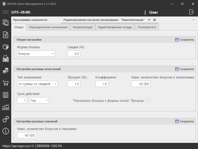 Раздел настроек скидки и разовых зачислений/списаний бонусов.