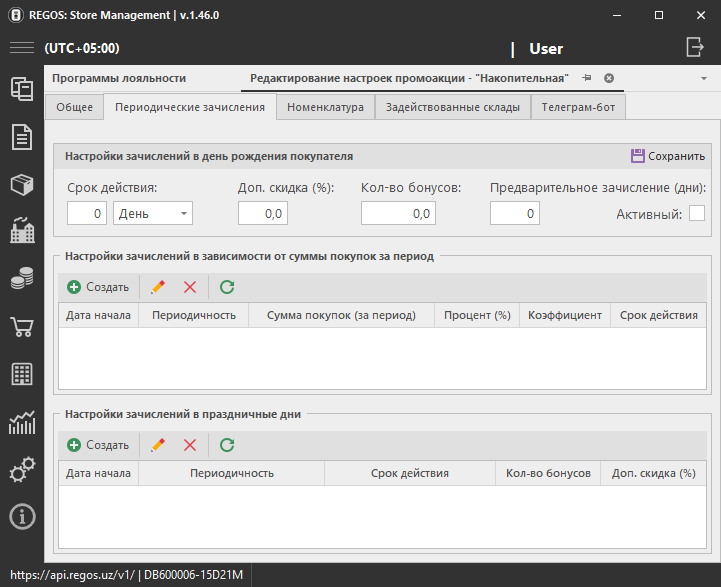 - Метка "Активный" - метка о том, что функционал бонусов и скидки в дни рождения покупателей задействован.