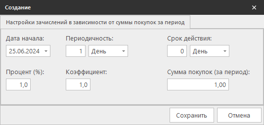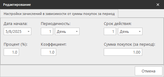 Редактрование настройки зачислений в зависимости от суммы покупок за период