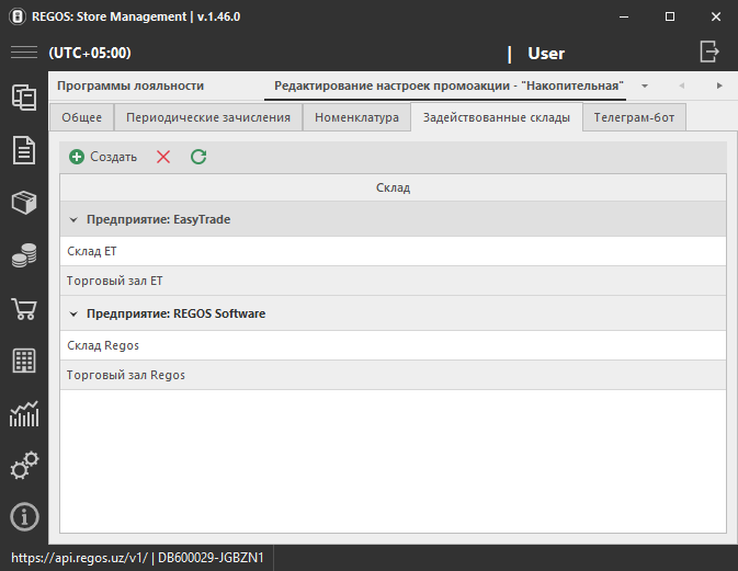 Вкладка Задействованные склады позволяет указать склады, при отгрузке с которых на товары распространяется программа лояльности.