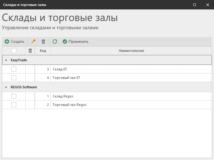 В появившемся окне необходимо отметить нужные склады и нажать кнопку Применить.