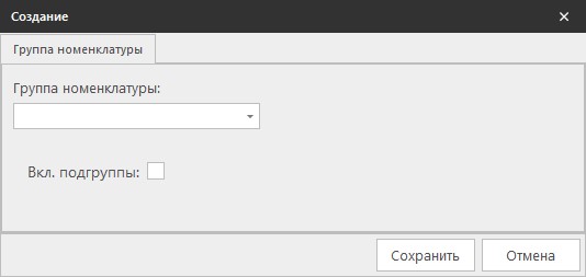 - Группа номенклатуры - выбрать из выпадающего списка нужную группу номенклатуры;