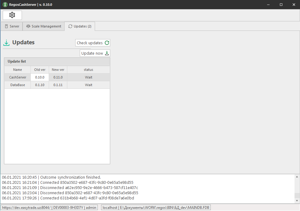 Раздел предназначен для выполнения обновлений REGOS: CashServer, подключенной БД и касс REGOS: POS.
