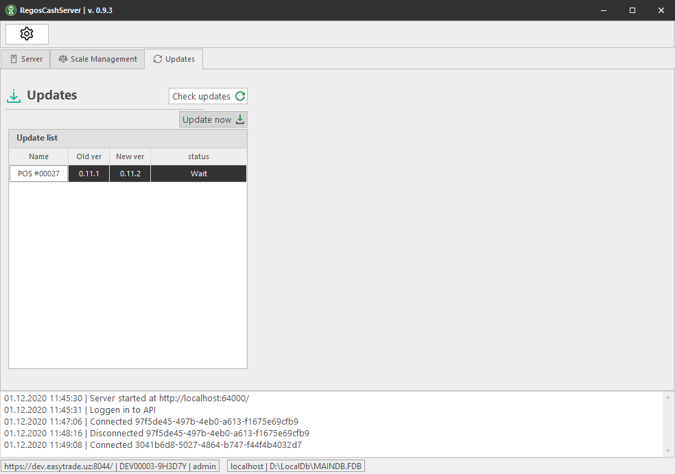 Через REGOS: Cash Server можно обновить подключенные к выбранному серверу касс REGOS: POS. Кассы не должны быть в режиме продажи/возврата (должно быть открыто главное окно). При нажатии кнопки "Update now", наличии подключенных касс в статусе "Wait" и наличии обновлений, кассы автоматически заблокируются и запустится процесс обновления. После завешения обновления, все обновленные REGOS: POS перезапустятся и будут готовы к работе.