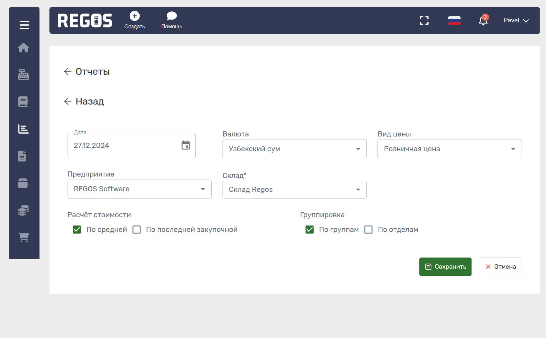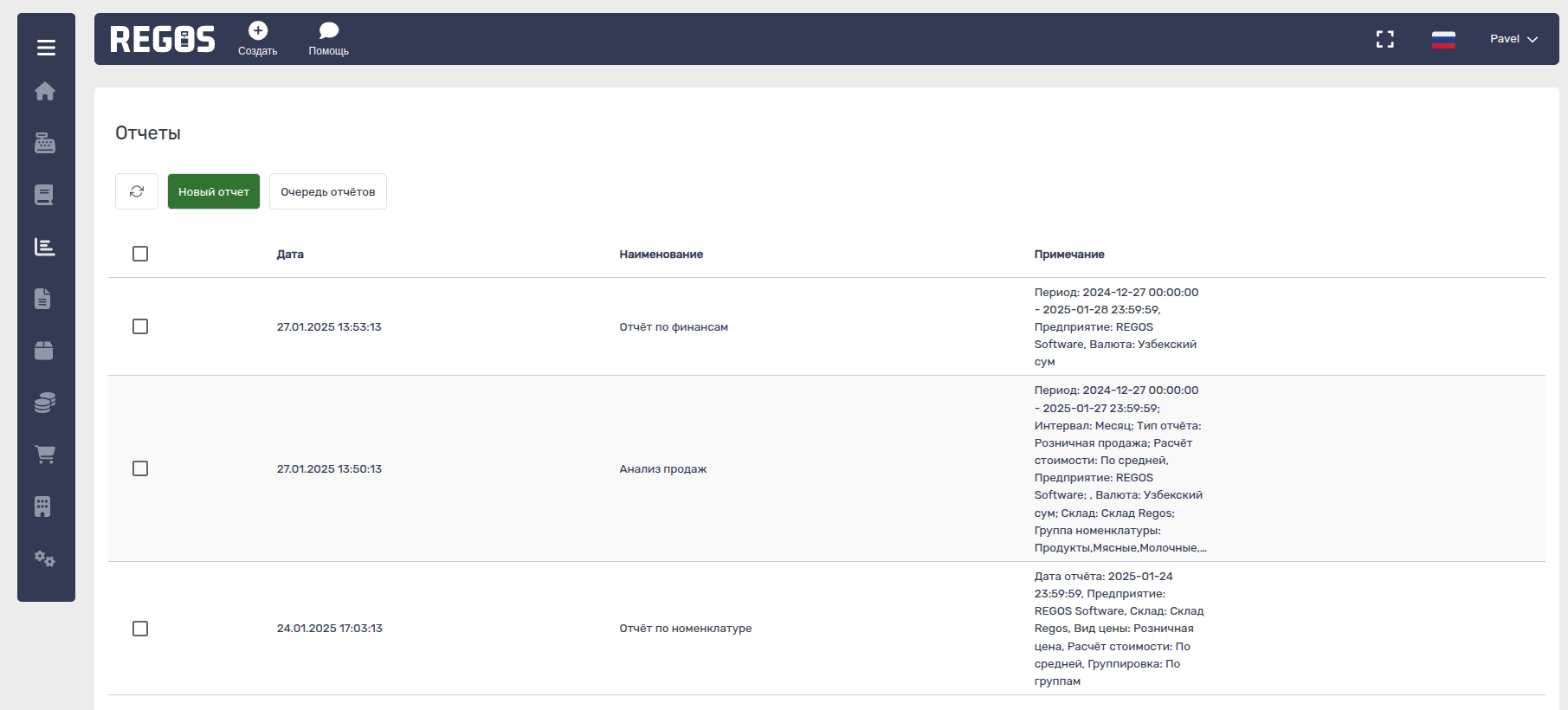 Для проведения аналитики и получения статистики о деятельности предприятия используются множество различных отчётов, в которых высчитываются данные за период. Отчёты строятся по запросу пользователя. При построении отчёта происходит обработка большого объёма данных, поэтому подготовка отчёта может занимать продолжительное время в зависимости от типа и периода отчёта. Запросы на подготовку отчётов поподают в очередь, а затем последовательно высчитываются. В очереди могут находится не более 3-х отчётов одновременна.
