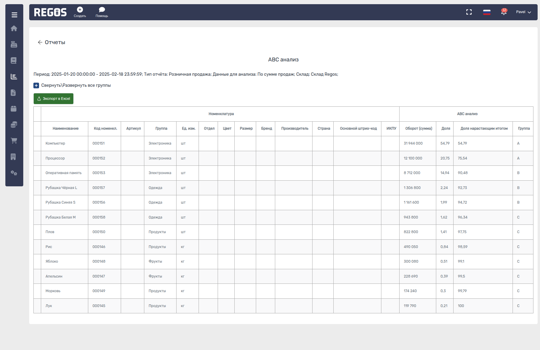 Подготовленный отчёт можно экспортировать в Excel с помощью кнопки Экспорте в Excel, расположенной вверху таблицы подготовленного отчёта.
