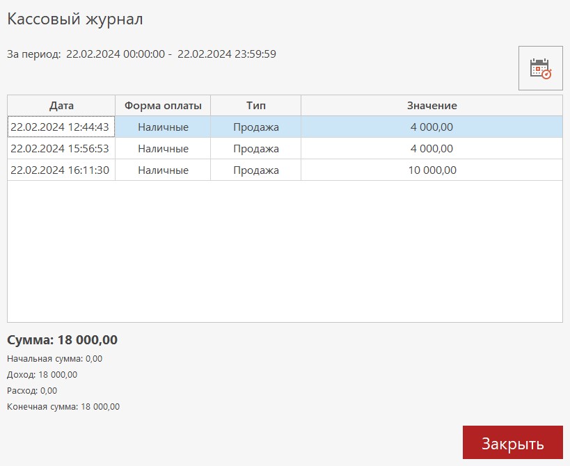 Кассовый журнал отображает движения наличных средств в кассе. Данные отображаются по текущей кассе за все смены.