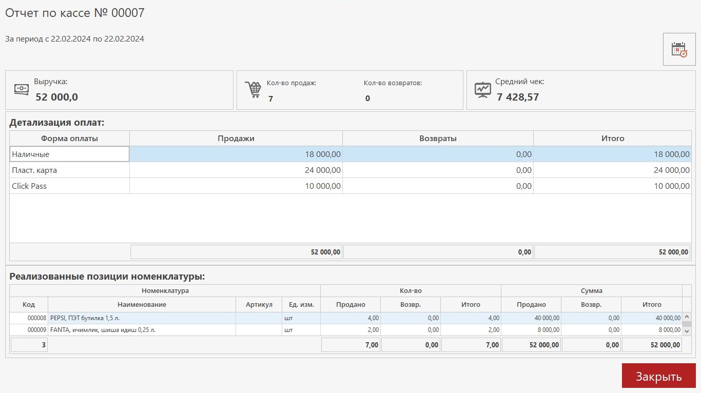 Отчет по кассе позволяет просмотреть подробную информацию о кассе и совершенных через неё продажах и возвратах. Также отображается список реализованных позиций номенклатуры.
