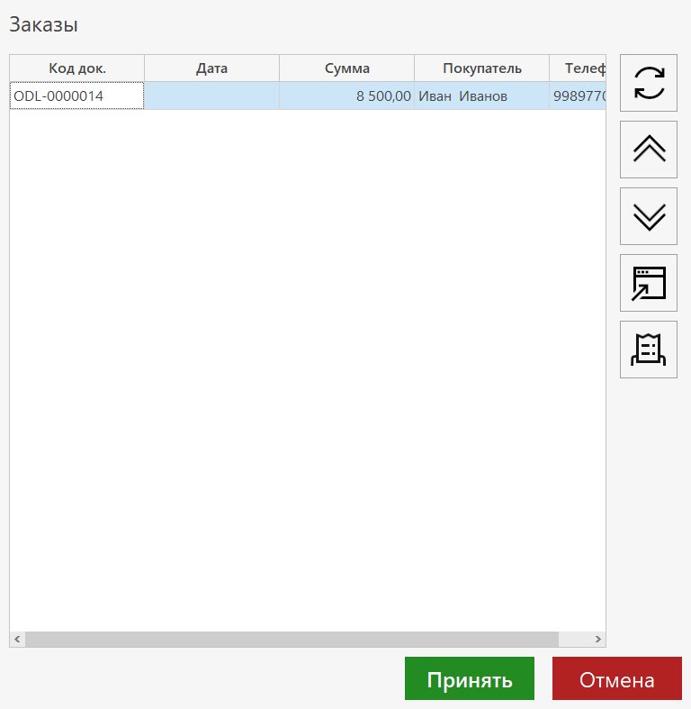 Для начала обработки заказа на кассе, нужный заказ необходимо выбрать из списка и нажать кнопку принять - после чего заказ будет принят в обработку на кассе (статус заказа изменится на "В обработке").