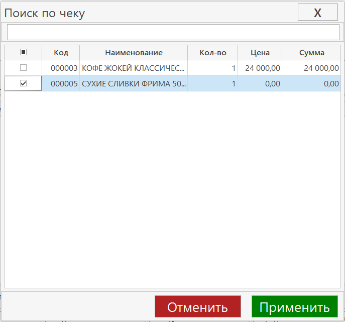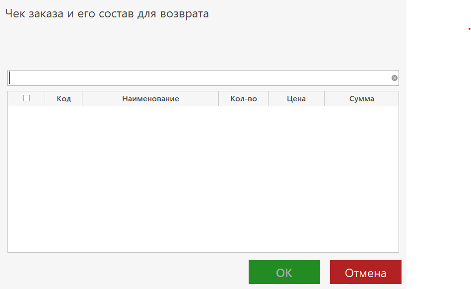 В открывшемся окне действует режим ввода штрих-кода уже закрытого чека. После считывания штрих-кода, система отобразит все позиции, указанные в чеке. Можно выбрать только нужные позиции для осуществления возврата.