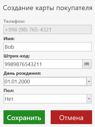 Примечание: Для создания штрих-кода на основе номера телефона покупателя, в поле Штрих-код справа расположена кнопка со значком штрих-кода, нажав на которую в поле штрих-кода будут скопированы 12 номера телефона покупателя, и добавлена рассчитанная контрольная цифра в конце. Таким образом будет создан штрих-код в формате EAN13.