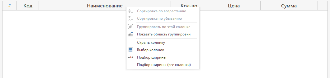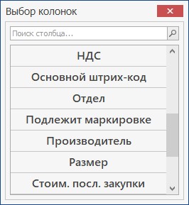 Для настройки отображения таблицы позиций номенклатуры нужно нажать правой кнопкой мыши на оглавление таблицы, в появившемся контекстном меню выбрать пункт "Выбор колонок".