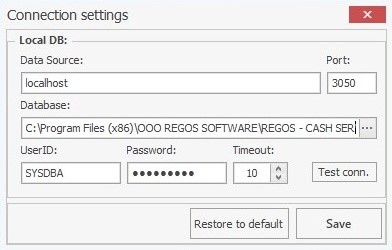 - Database - расположение базы данных на серверном компьютере. Задается при установке REGOS: CashServer;