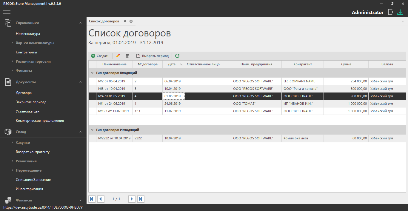 Договор является основанием для создания документов поступления или отгрузки контрагенту и осуществляения взаиморасчетов с контрагентом.