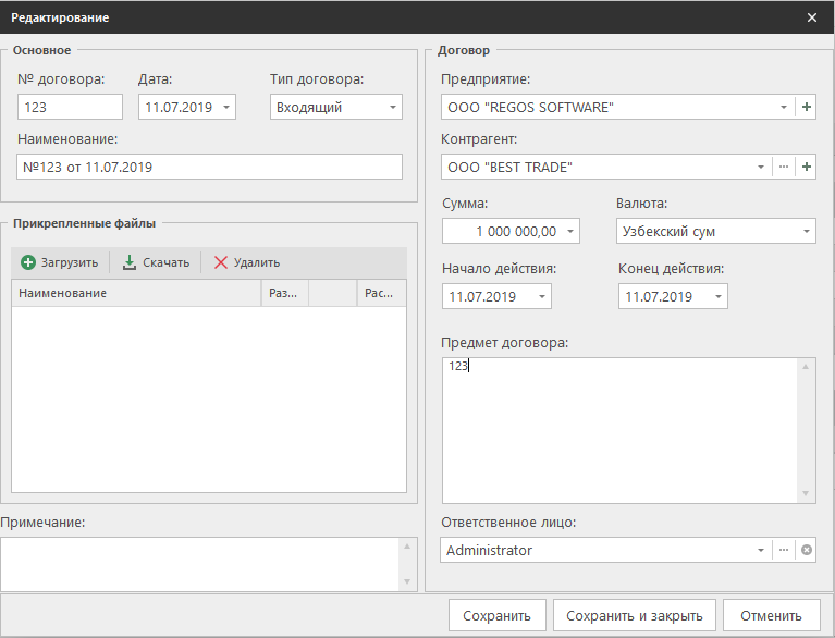 - Ответственное лицо - пользователь комплекса Regos, отвественный за договор. По-умолчанию указан текущий пользователь