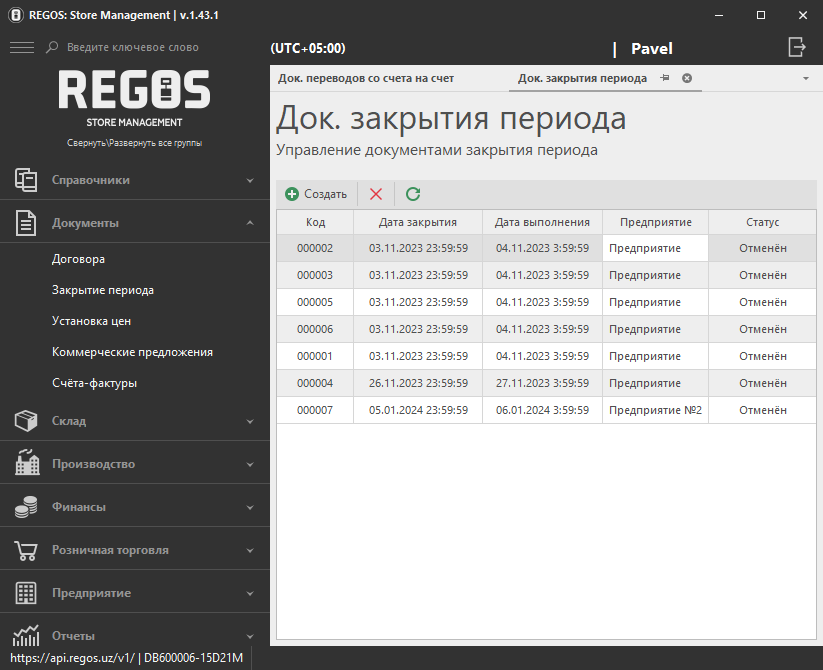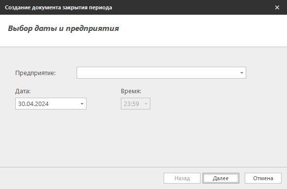 - Предприятие - наименование предприятия, для которого создаётся документ закрытия периода.