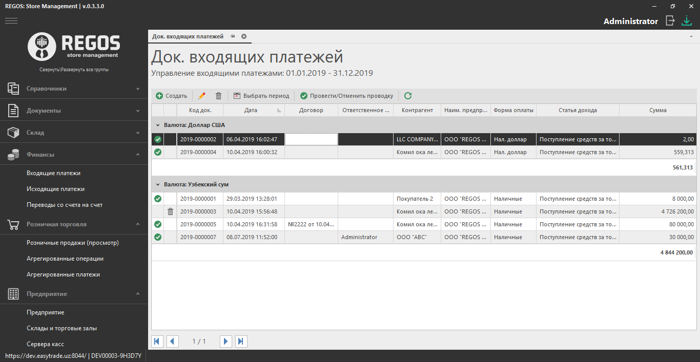 Входящие платежи группируются по типу валюты. Документы входящих платежей можно отфильтровать по периоду.