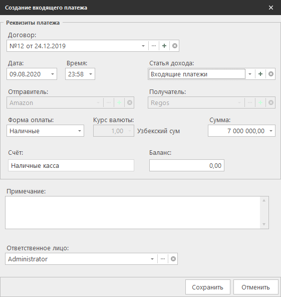 - Сумма - сумма входящего платежа. Заполняется автоматически при указании договора.
