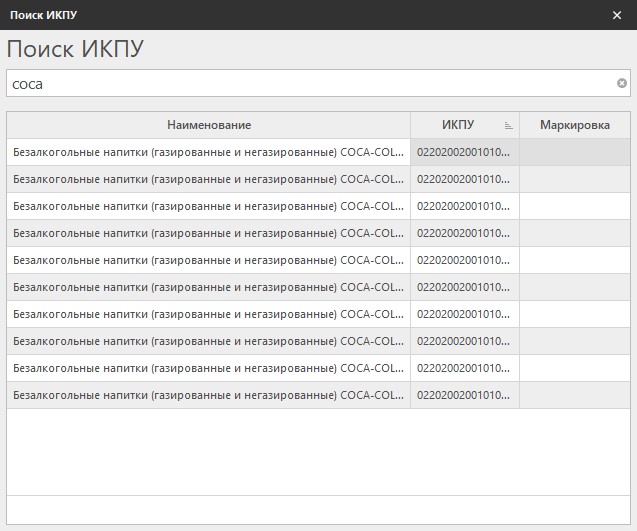 Для поиска необходимо нажать "🔍" справа в поле ввода. В окне "Поиск ИКПУ" нужно ввести наименование товара, затем выбрать подходящую найденную позицию номенклатуры. При наличии обязательной маркировки метка "Подлежит маркировке" устанавливается автоматически.