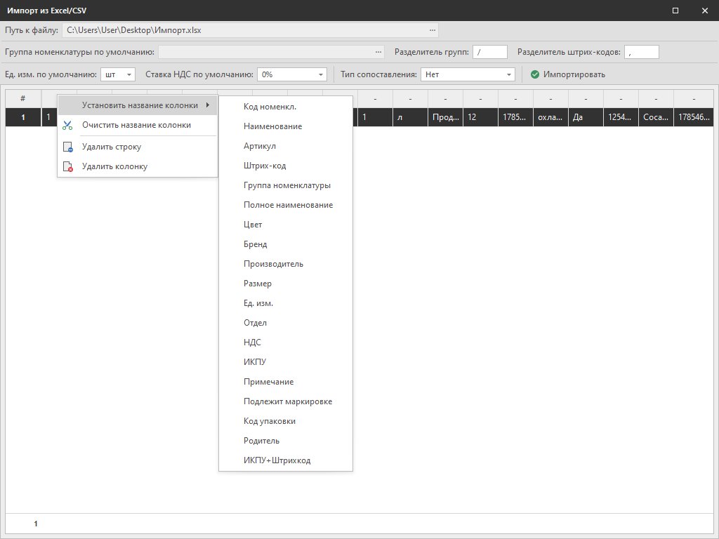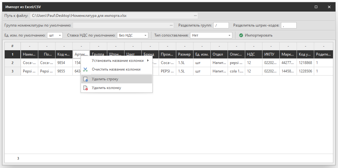 .Если в импортируемой таблице были заголовки и при добавлении они отобразились в первой строке импорта, то рекомендуется их удалить(иначе оглавление будет импортировано как отдельная позиция номенклатуры), для удаления необходимо нажать правой кнопкой мыши по данной строке, в появившемся контекстном меню необходимо выбрать пункт Удалить строку.