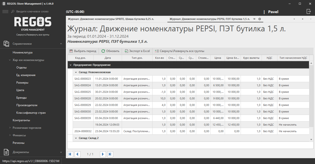 Двойным кликом по записи в журнале движения номенклатуры можно перейти в следующие операции документов: списания/занесения, перемещения, поступления от контрагента, возврат контрагенту, отгрузка контрагенту, возврат от контрагента, агрегация розничных продаж.