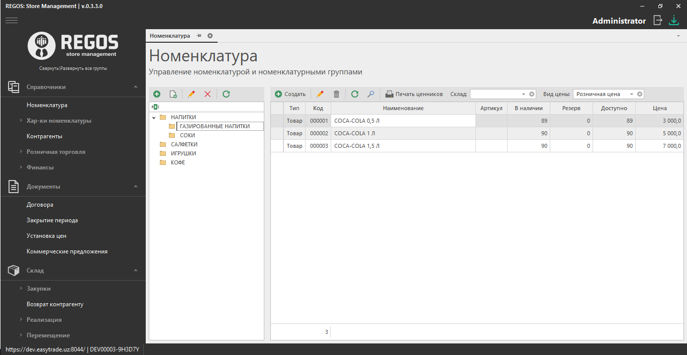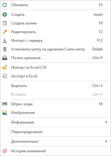 Пункт "Импорт с сервера" в контекстном меню позволяет импортировать наименование позиции номенклатуры с серверов компании REGOS.