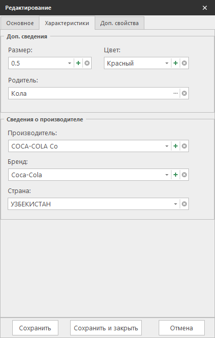 На вкладке "Характеристики" можно заполнить данные по размерам, цвету и производителю номенклатуры.