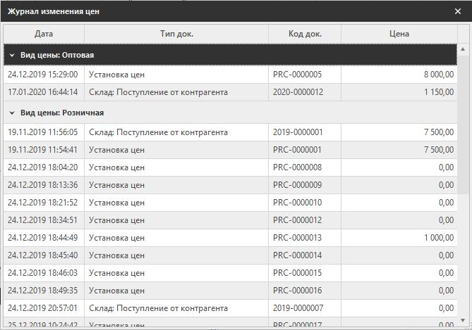 Пункт "Информация: Журнал изменения цен" в контекстном меню позволяет просмотреть подробную информацию об изменениях цен выбранной позиции номенклатуры.