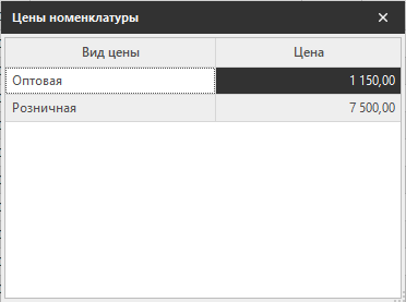 Пункт "Информация: Цены номенклатуры" в контекстном меню позволяет просмотреть установленные цены выбранной позиции номенклатуры.