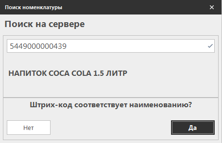 В открывшемся окне отсканируйте сканером штрих-кодов или введите вручную штрих-код номенклатуры. При наличии введённого штрих-кода в базе отобразится название найденной позиции номенклатуры и вопрос о том, соответствует ли найденное название штрих-коду.