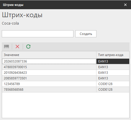 Пункт "Штрих-коды" в контекстном меню открывает окно, в котором можно управлять штрих-кодами для выбранной позиции номенклатуры: