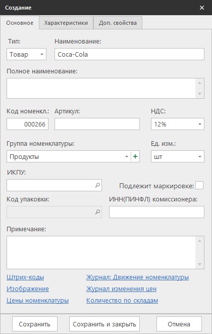 Примечание: Создание штрих-кода и изображения для номенклатуры доступны только после сохранения(создания) номенклатуры.