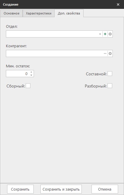 На вкладке "Доп. свойства" заполняются данные по отделу, в котором находится единица номенклатуры и минимальный остаток. Кроме того можно указать, кто является постоянным поставщиком выбранной единицы номенклатуры.