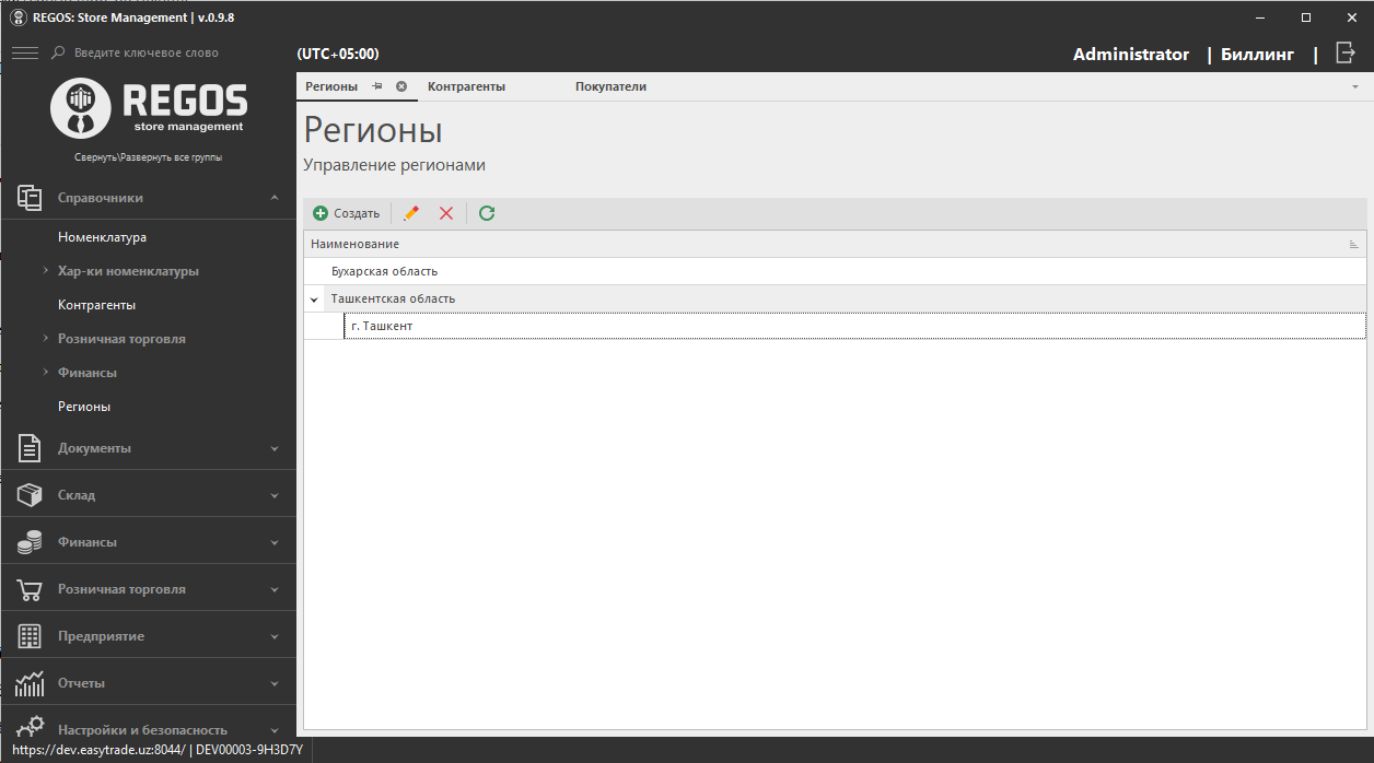 Раздел содержит справочник регионов для дополнительного группирования розничных покупателей.