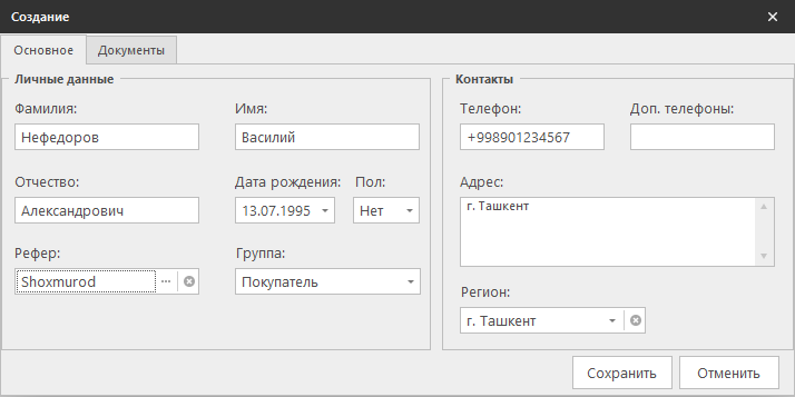 На вкладке "Документы" можно указать документы, подтверждающие личность покупателя.