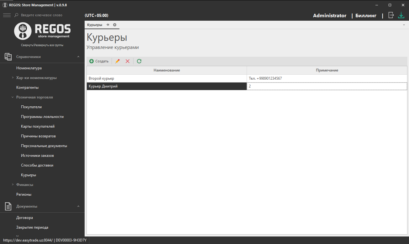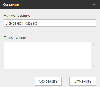 Справочник содержит список курьеров. Полученные заказы для доставки передаются на доставку курьерам, указанным в данном разделе.