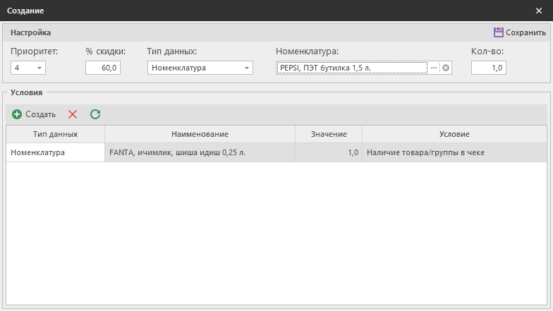 - Кол-во - Максимальное количество единиц номенклатуры в чеке, на которые будет предоставлена скидка.