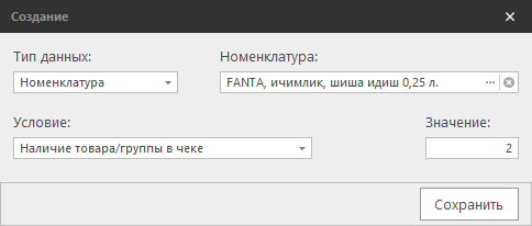 - Наличие товара/группы в чеке - при наличии номенклатуры в чеке(для типа данных - номенклатура и группа номенклатуры),