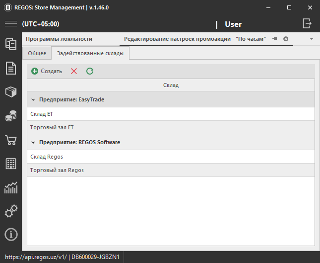 Задействованные склады добавляются с помощью кнопки Создать.