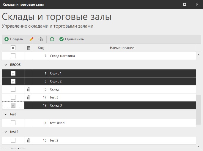 Склады добавляются с помощью кнопки "Создать". В открывшемя окне нужно отметить склады и нажать "Применить".