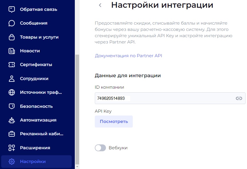 Данные для интеграции находятся в личном кабинете UDS в разделе "Настройки" -> "Интеграции".