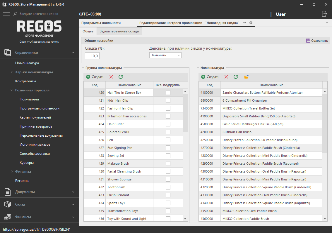 На вкладке Общее расположены настройки скидки и задействованной номенклатуры.