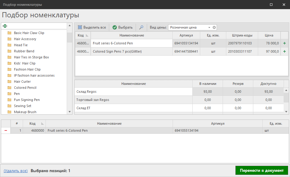 В открывшемся окне необходимо выбрать одно или более позиций номенклатуры с помощью кнопки Выбрать или двойным кликом; после чего добавить выбранную номенклатуру к скидке при помощи кнопки Перенести в документ.