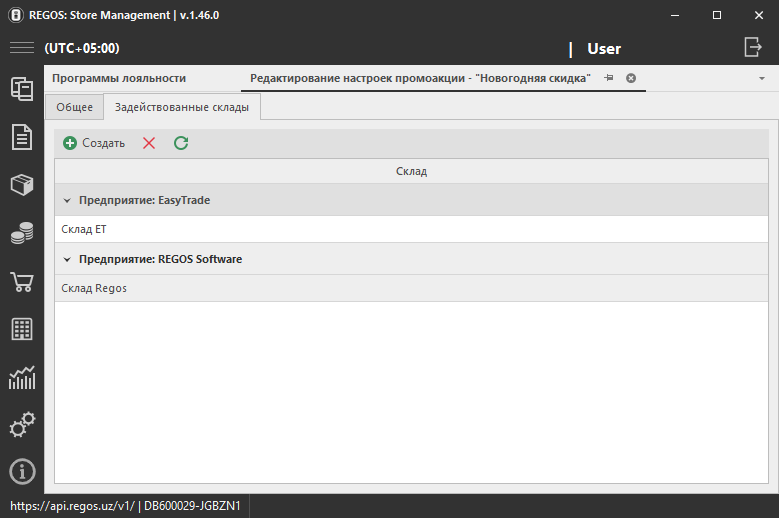 Задействованные склады добавляются с помощью кнопки Создать.