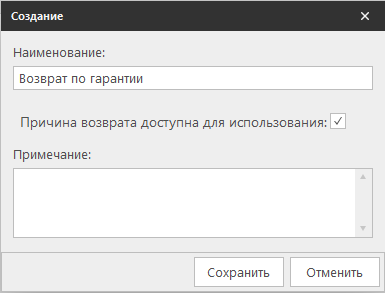При создании причины возврата требуется указать: