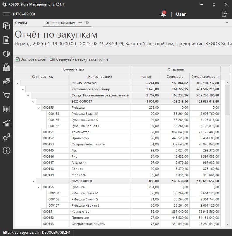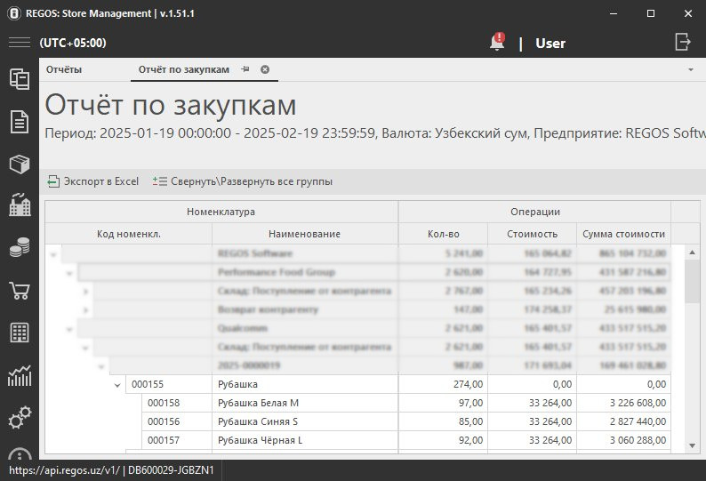 Отчёт — показывает количество и стоимость поступившей и возвращенной номенклатуры на склады по контрагентам.