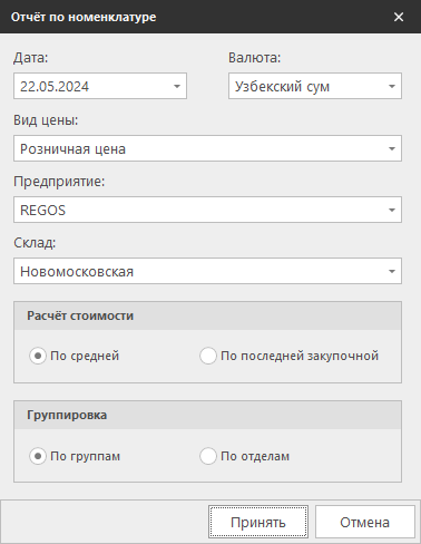 - Валюта - Валюта, в которой отобразятся цена и стоимость номенклатуры в подготовленном отчёте;