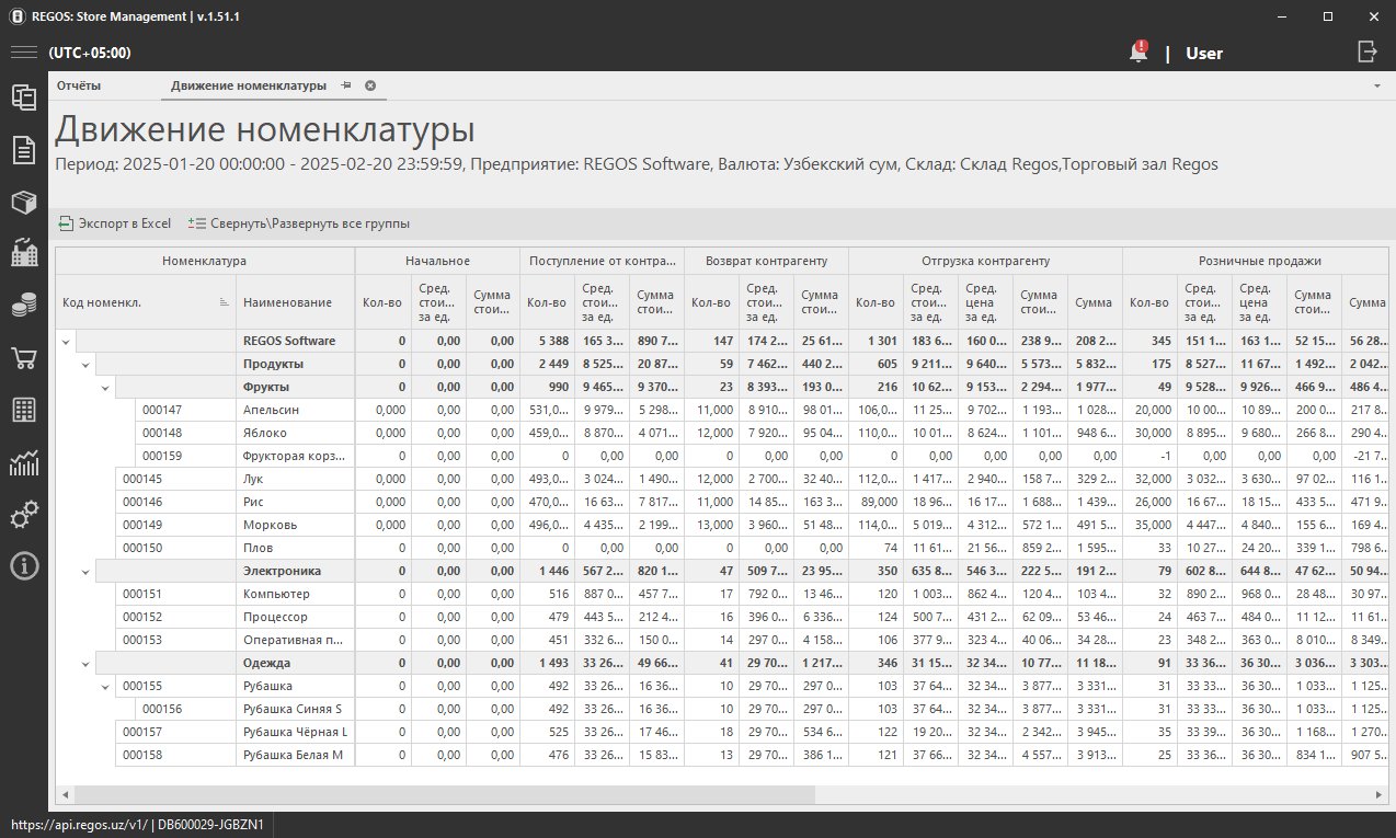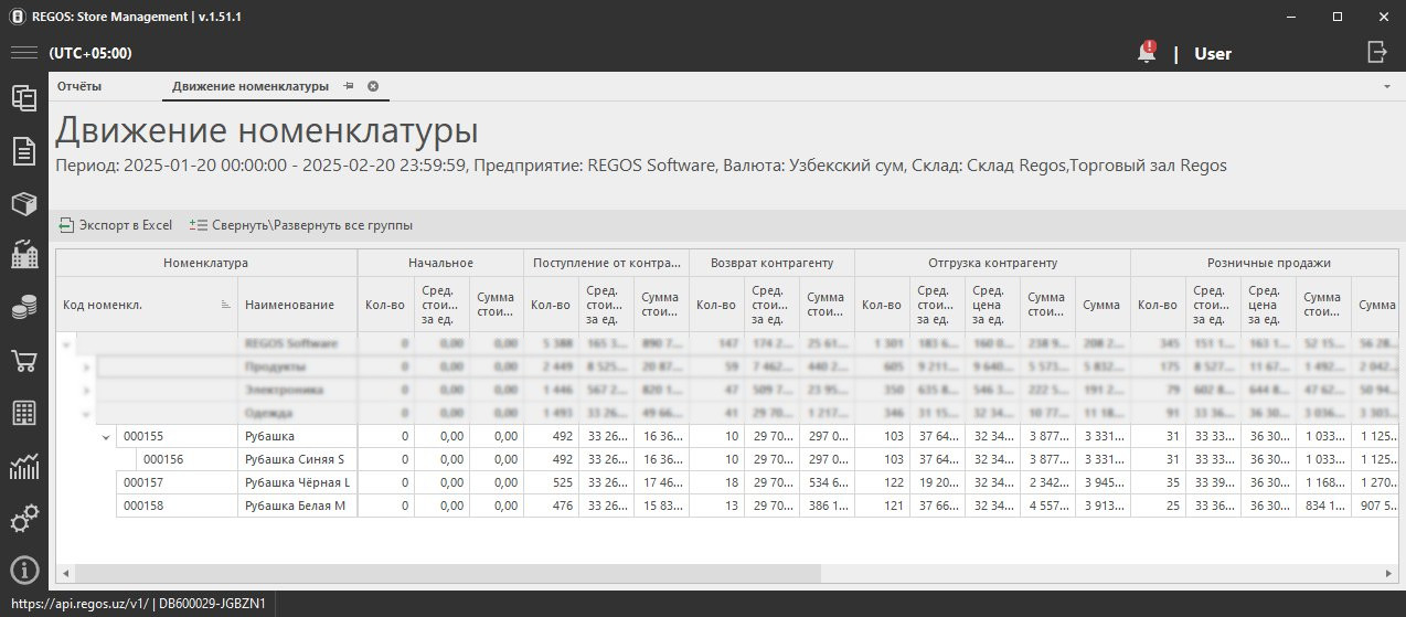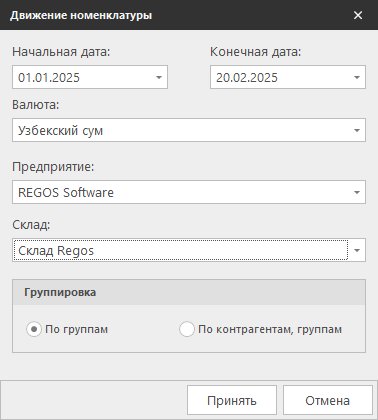 Отчёт "Движение номенклатуры" — показывает все перемещения номенклатуры на складе.