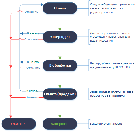 При начале обработки заказа на кассе, заказу устанавливается статус В обработке и определяется касса, на которой обрабатывается заказ. При переходе на кассе REGOS: POS в окно оплаты, заказу устанавливается статус Оплата (продажа).