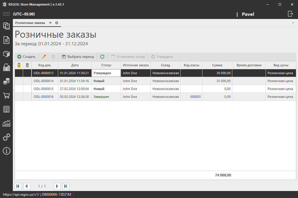 При создании документа розничного заказа он получается статус Новый. Созданный документ необходимо открыть и заполнить номенклатурой. Далее заказу в статусе Новый необходимо утвердить.